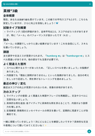 「ライティングの練習方法は?」「よく間違えるポイントは?」など、あらかじめ用意された質問をワンクリックで選べるほか、学習者が質問を入力するとUGUIS先生が回答してくれます。 さらに、「よく間違えた文法を具体的に教えて」「よく間違える単語を一覧で出して」など、より詳細なアドバイスもUGUIS先生から受けられます。 指導者はUGUIS先生と共に学習者のこれまでの取り組みを見守りながら、学習者自身が自律的に理解を深め、成長していくプロセスを支援できます。