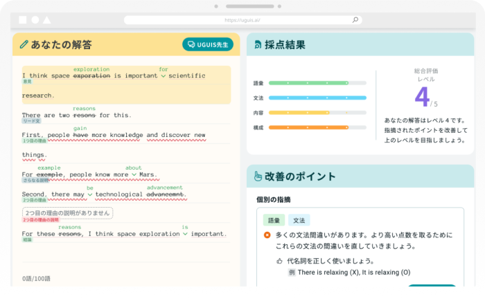 UGUIS.AIは、AI技術を活用した英語学習を支援するサービスです。英検®のライティング・スピーキングや大学入試の英作文に対応しており、本番さながらの問題をAIが自動生成して出題します。
